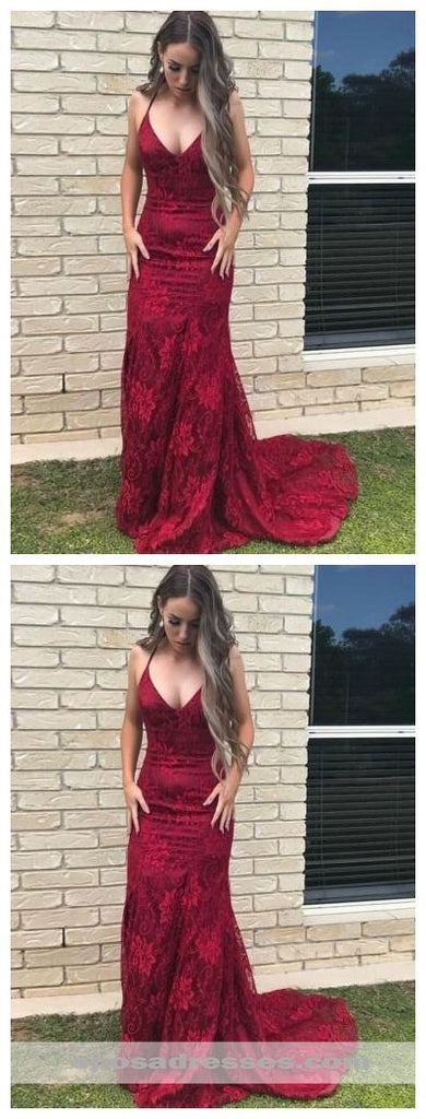 Burgundy Lace Mermaid Long Evening Prom Dresses, Cheap Sweet 16 Dresses, 18313