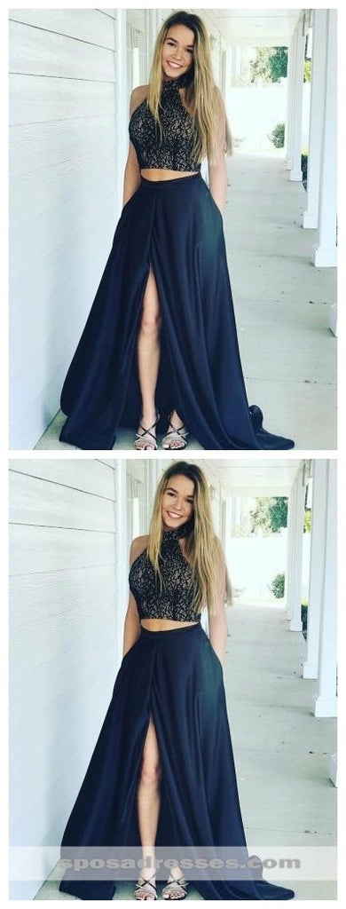Navy Halter Two Pieces Side Slit Long Evening Prom Dresses, Cheap Sweet 16 Dresses, 18314