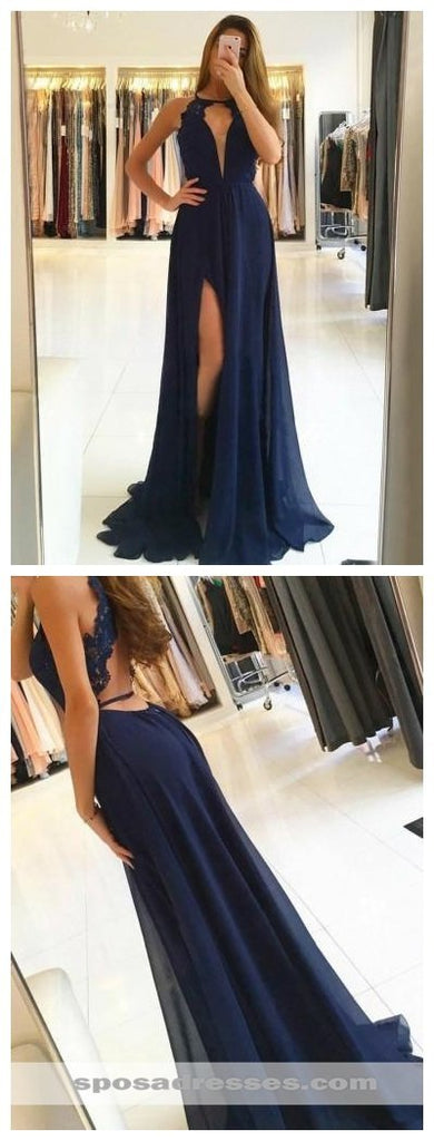 Sexy Open Back Halter Navy Long Evening Prom Dresses, Cheap Sweet 16 Dresses, 18309