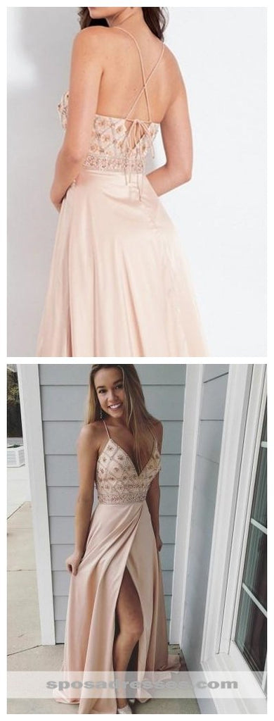 Side Slit Champagne Spaghetti Straps Long Evening Prom Dresses, Cheap Sweet 16 Dresses, 18308