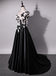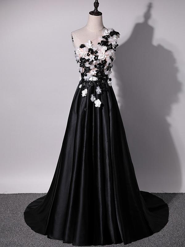 One Shoulder Handmade Flower Black A-line Long Evening Prom Dresses, 17624