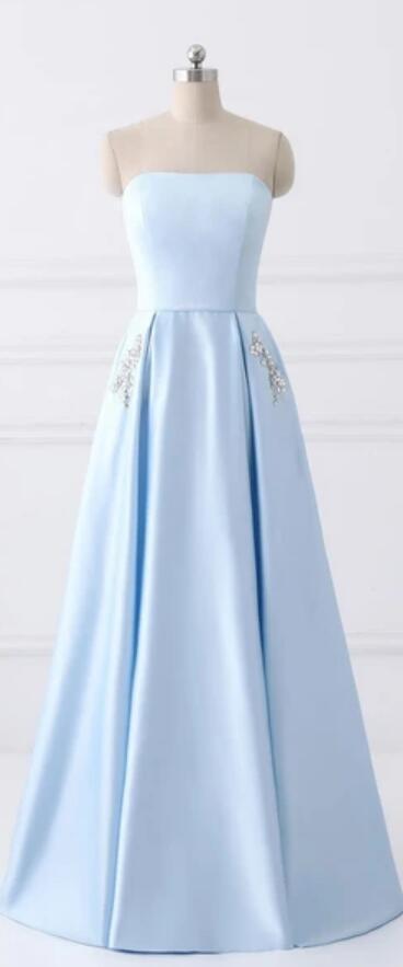 Simple Cheap Strapless Sky Blue Beaded Long Evening Prom & Bridesmaid Dresses, 17348