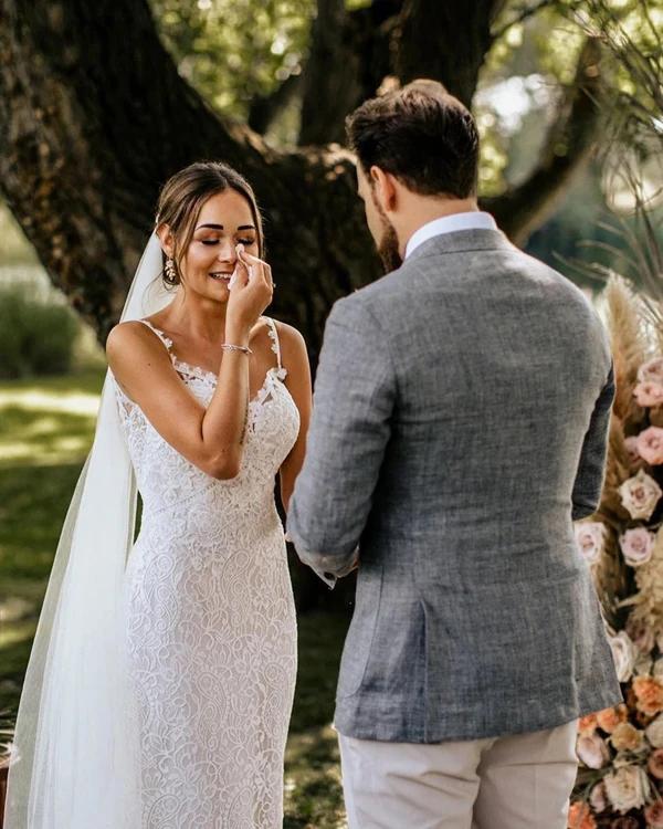 Simple Mermaid Sleeveless Spaghetti Straps Lace Wedding Dresses,WD745